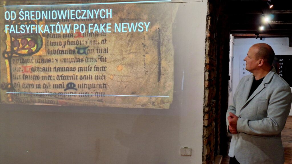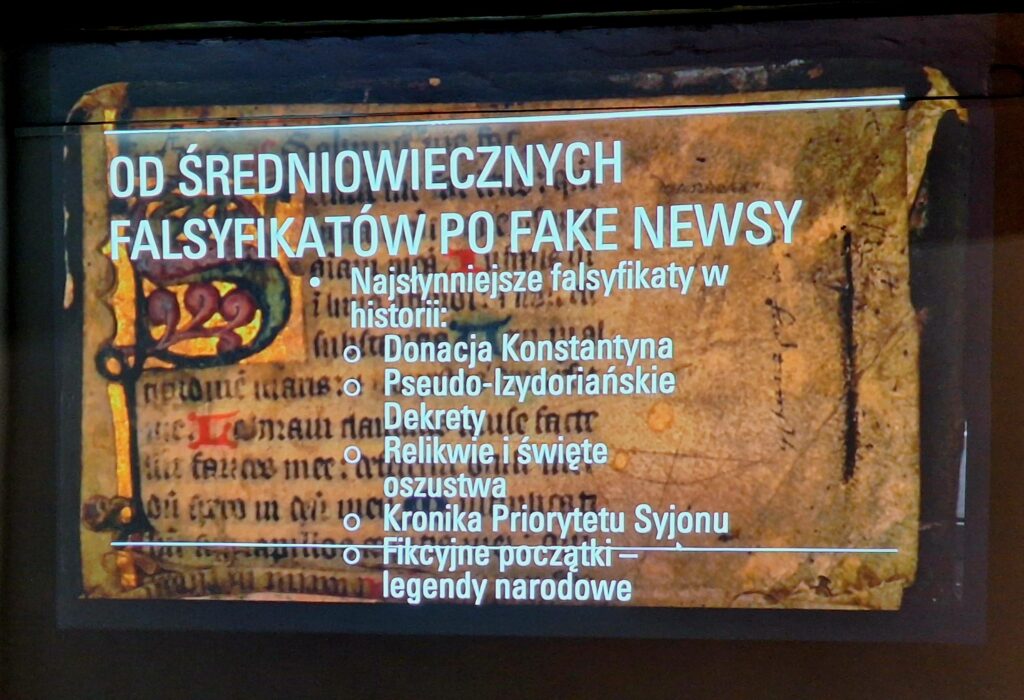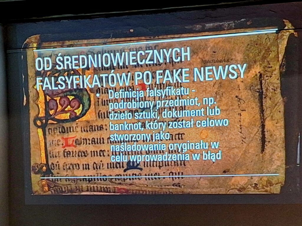 Pan Patryk opowiedział nam o odwiecznej ludzkiej skłonności do rozpowszechniania nie prawdziwych informacji. W średniowieczu falsyfikaty powstawały na potrzeby uwierzytelnienia stanu posiadania lub utrzymania władzy. W trakcie wykładu prowadzący pokazał jak dawni fałszerze i współcześni twórcy fake newsów korzystają z podobnych mechanizmów. Pokazał nam jak trudno odróżnić prawdę od