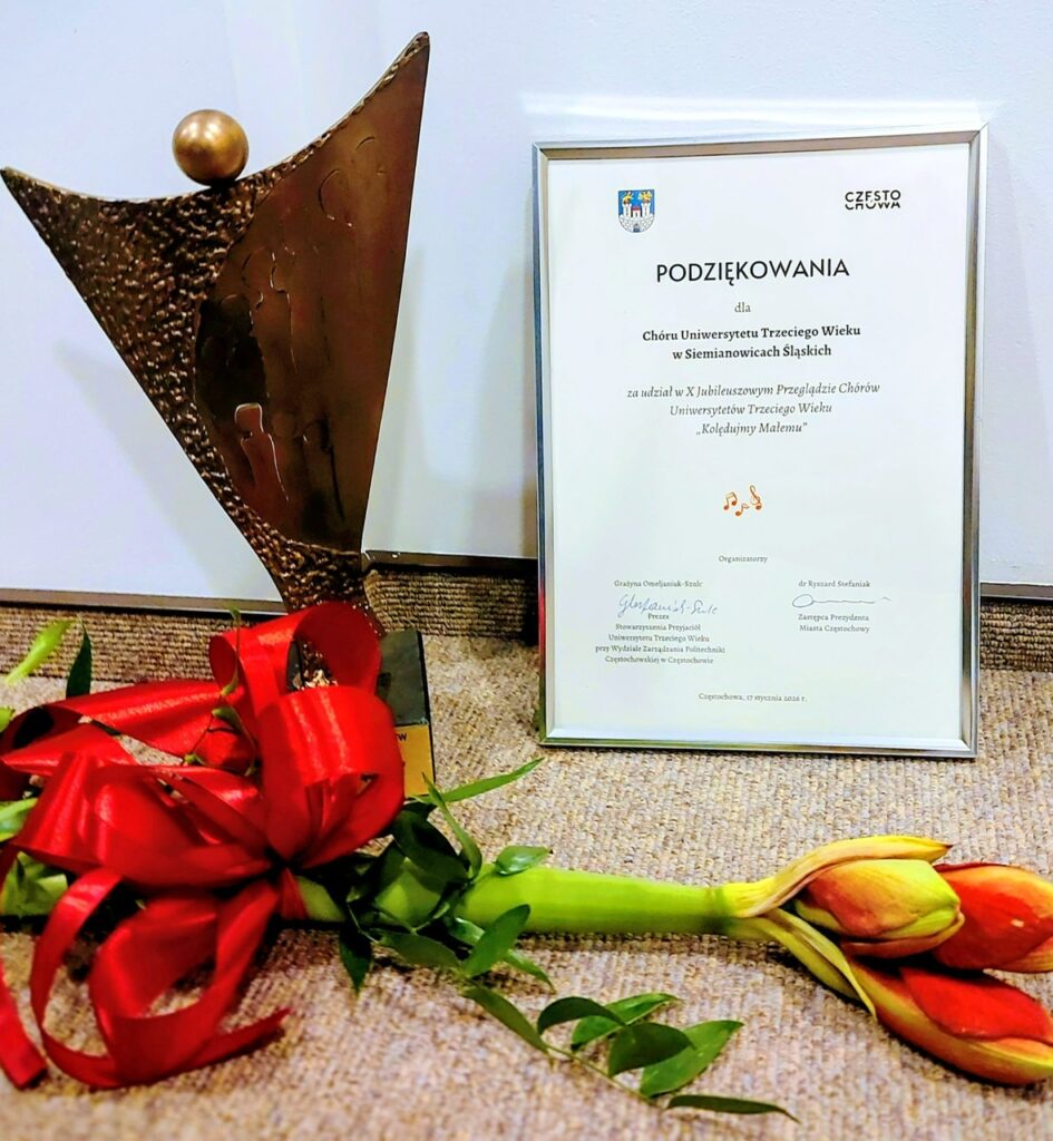 17 stycznia 2026 roku chór Siemianowickiego Uniwersytetu Trzeciego Wieku wziął udział w X Przeglądzie chórów Uniwersytetów Trzeciego Wieku z województwa śląskiego i regionów ościennych. Po raz pierwszy w przeglądzie wzięły także udział owacyjnie przyjęte chóry z Litwy i Ukrainy. Wydarzenie odbyło się w sali koncertowej Filharmonii Częstochowskiej i objęte zostało patronatem Prezydenta Miasta Częstochowy oraz honorowym patronatem dr Anny Zasady-Chorab, dyrektor Regionalnego Ośrodka Polityki Społecznej Województwa Śląskiego. Moment wejścia na scenę był dla nas niezwykle emocjonujący. W blasku świateł, przy pełnej sali, z bijącymi sercami i uśmiechami na twarzach, stanęłyśmy przed publicznością gotowe, by podzielić się radością śpiewu. Brawa są zawsze dla naszego chóru najlepszą nagrodą. Wszystkie zaproszone chóry pięknie wykonały przygotowane przez siebie kolędy i pastorałki. Zwieńczeniem koncertu był wspólny śpiew kolędy „Bóg się rodzi” przez blisko 300 chórzystów. Kolęda w takim wykonaniu wybrzmiała potężnie i wzruszająco, pozostawiając w sercach uczestników i słuchaczy prawdziwą radość.