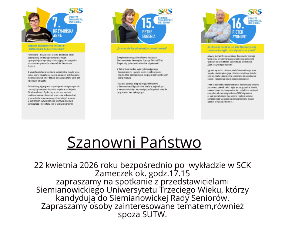 W związku z udziałem seniorów i słuchaczy Siemianowickiego Uniwersytetu Trzeciego Wieku w wydarzeniu Targi SILVER SILESIA 2025 w Górnośląskim Parku Etnograficznym w Skansenie w Chorzowie w dniu 10 września 2025r. zmieniamy datę zapisów na nowy Rok Akademicki SUTW 2025/2026.